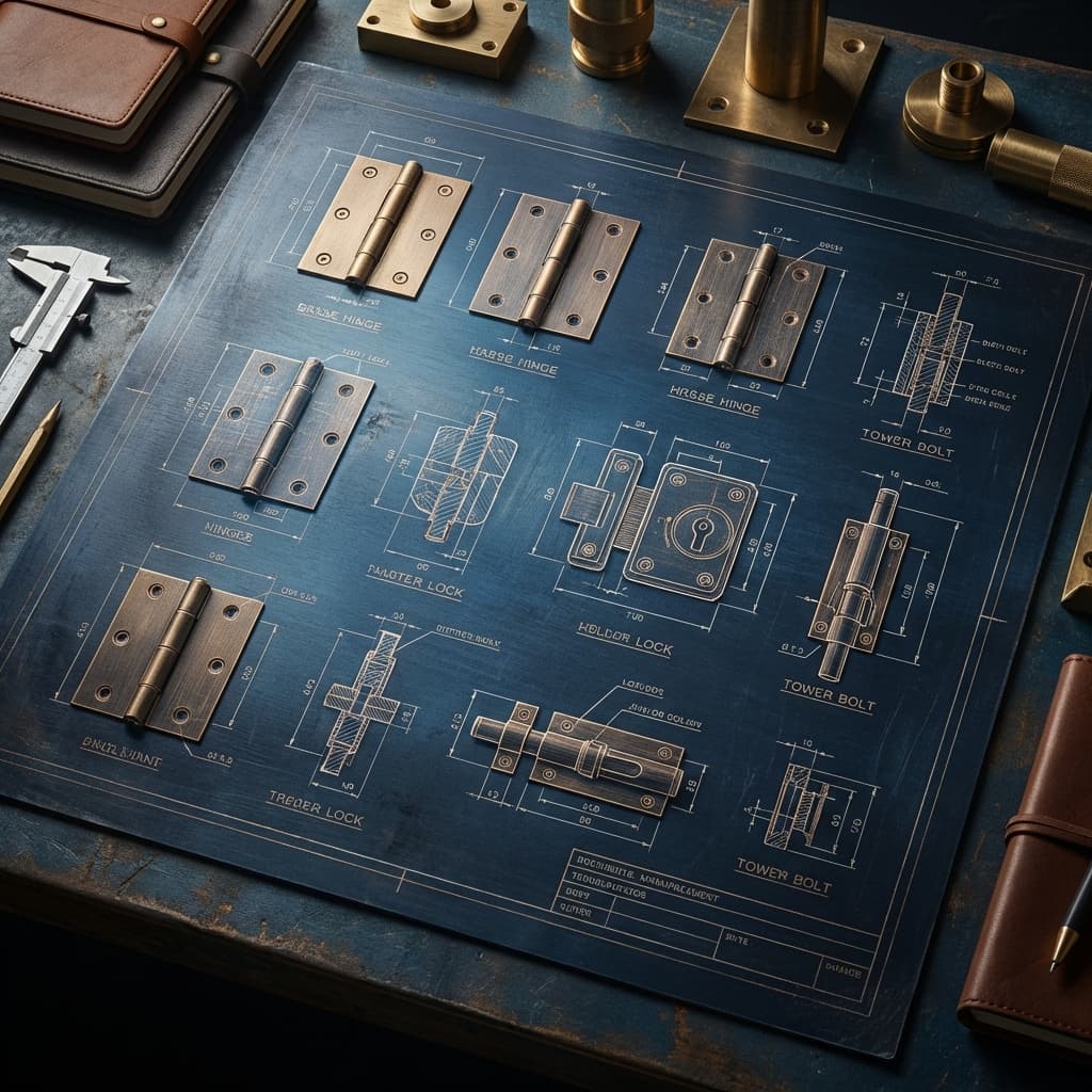 Durable brass and aluminium tower bolts and hinges for architectural hardware.